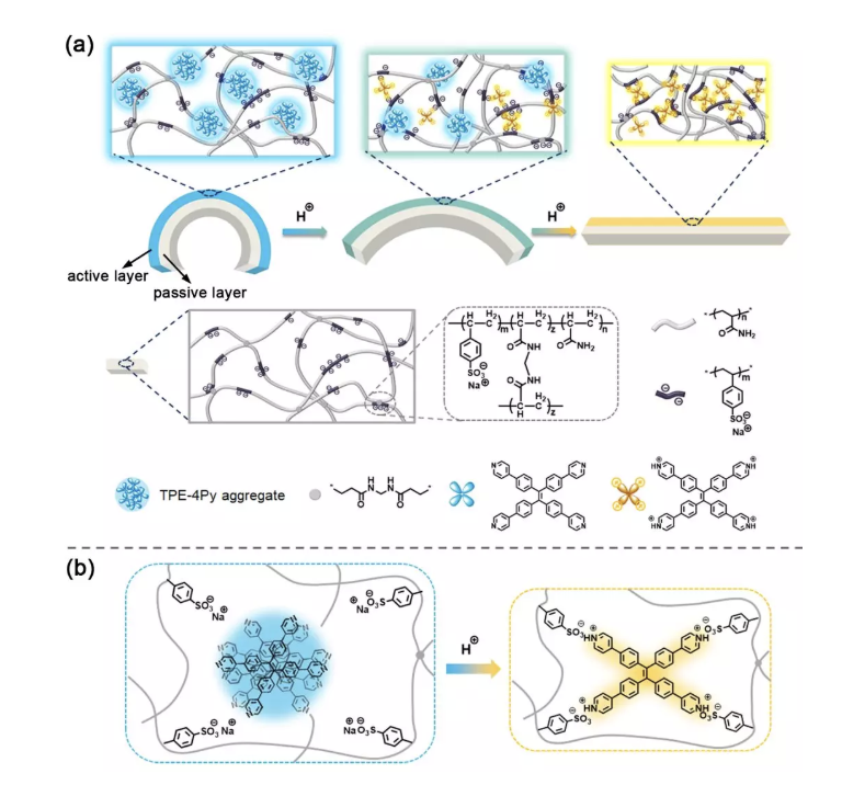 在自然界中,许多生物可以同时改变其颜色和形状。例如,为了让授粉昆虫能够更容易地辨认花期,俗称“昨天-今天-明天”的双色茉莉,在花朵绽开的过程中,花的颜色经历紫色-淡紫色-白色的变化;在动物界,当伞蜥蜴受到惊吓时,其颈部四周的伞状皮膜打开,同时皮膜颜色从褐色变为亮黄色。尽管科学家们一直致力于仿生人工智能材料的开发,但是,构建在单一外界刺激下能够同时改变发光颜色、强度和形状的材料仍具挑战。而实现这种材料的关键在于发光颜色、强度和形状的改变要基于同一元素。