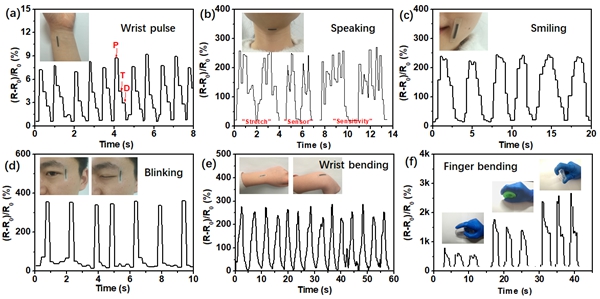 该课题组还把该新型的可穿戴的应力传感器穿戴在人体不同部位,用于全范围的人体运动的检测中,其中可以检测人手腕上由于脉搏跳动引起的微小的皮肤运动变化,并且把人体脉搏跳动的3个特征峰清晰的检测出来;同时,穿戴在颈部喉咙位置,可以清楚的检测出人体声带发声并辨认出不同的音节变化;此外,具有大形变的人体关节运动变化也能检测出来。