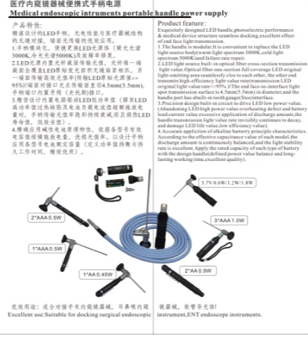 产品介绍:便携式LED内窥镜手柄 手柄模块化、LED光源内置光纤截面传输光值、精密设计内置电路驱动LED低功率值、精确应用碱性电池原理特性施放电量,优稳光值率