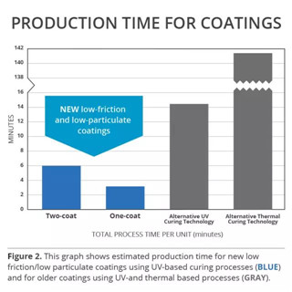 这些最近研发的涂层配方还可能为制造商带来经济效益。聚合物和交联剂在这些涂层中的有效使用意味着它们通常可以带来性能的改进,同时显著减少了在制造中使用的涂层材料的用量。与以前的单层和多层UV和热喷涂层工艺相比,这不仅可以降低供应成本,还可以缩短生产时间(图2)。在评估新的涂层选择时,设备制造商应当与供应商合作,了解所采用技术的总体成本,包括资本支出和运营成本。