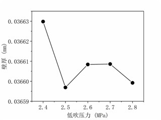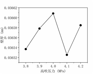 从球囊壁厚大小的变化范围来看,图9和图10,低吹压力相比拉伸速度对球囊壁厚的影响较小。吹胀压力的大小和球囊壁厚之间呈现非线性关系,这也是由于材料的非线性引起的。球囊在一次拉伸完成的情况下,已经基本成型,高吹压力的目的是使球囊与模具未贴合部分实现紧密贴合。高吹压力的变化会造成球囊的中间壁厚的波动,但是波动的幅度也是很小的。总的来说,吹胀压力对球囊的壁厚为非线性的影响关系。低吹压力对球囊的中间壁厚有一定的影响,高吹压力对球囊的中间壁厚影响很小。