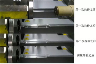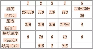 第四步是升高压力的同时对料泡进行二次拉伸,两端夹具的拉伸速度为10mm/s,拉伸