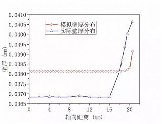 数值模拟结果与实际成型球囊工作段的壁厚分布对比图如图6所示。二者有相近的变化趋势,尽管二者存在差异:工作段主要部分的实际壁厚值比模拟的壁厚值小,靠近锥部部分实际壁厚值大于模拟的壁厚值。实际值整体偏小的可能是由于一次拉伸和二次拉伸结束以后高温保压和冷却阶段,材料产生结晶和回缩导致壁厚减小,这在模拟中没有考虑。