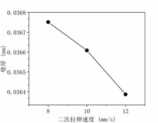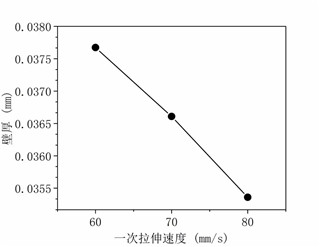 考虑拉伸和吹胀压力工艺:一次拉伸、二次拉伸速率、低吹压力、高吹压力四个因素对最终中间段壁厚的影响。其他工艺参数为定量,分别以一次拉伸速度和二次拉伸速度为变量,拉伸速率对成型壁厚的影响结果如下图7和图8,可以看出拉伸速度越大,球囊壁厚越小。其中二次拉伸速度对中间壁厚的影响较小。