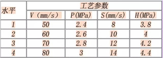 根据实际的加工工艺参数和范围,对于一次拉伸速度(V),低吹压力(P),二次拉伸速度(S),高吹压力(H)这四个因素进行正交实验。每个因素设置四个水平,对4因素4水平,选取田口型正交表作为实验方案,如表2所示。
