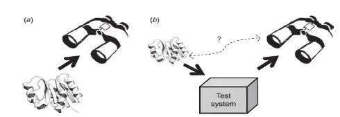 如下图所示,仪器分析方法(a)研究的是样品本身直接相关的特性,如样品的分子量大小,样品的电荷等;与此相对,生物学检测方法(b)首先要存在或者建立一个Test system,然后加入样品反应,检测样品引起Test system的变化,其检测和样品本身是间接相关,检测目标分子实体不是样品本身,这是其检测目标的间接性。如某药物对肿瘤细胞的杀伤实验,Test system为细胞,引起的变化是细胞的死亡,检测目标分子实体为代表活细胞的ATP浓度或者代表死细胞的LDH浓度。