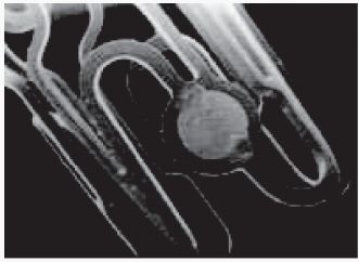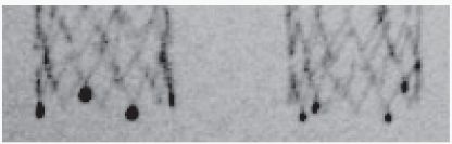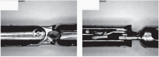 激光焊接镍钛合金支架金标志物示意图如图1所示,以及焊有金标志物的支架在 X 线下的显影效果如图2所示。激光焊接工艺的研究和使用,使两个极小零件的有效连接成为可能,这也是激光焊接在医疗器械领域应用越来越广泛的原因。